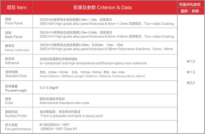 板面最大尺寸可达1800×7800,由于中间有蜂窝芯粘合,板面亦有极高的平整度。内层为特制的六边形铝蜂窝,由硬度达到H19的铝合金构成,作为粘附在夹层结构中的芯板,在切向上承受压力。这些相互牵制的密集蜂窝犹如许多小工字梁,可分散承担来自面板方向的压力,使板受力均匀,保证了面板在较大面积时仍能保持很高的平整度。另外,空心蜂窝还能大大减弱板体的热膨胀性。
