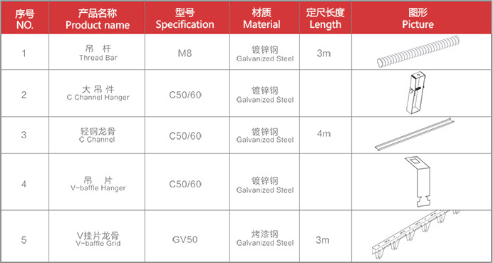 V系列板选用附件表 V-BAFFLE SUSPENSION SYSTEM