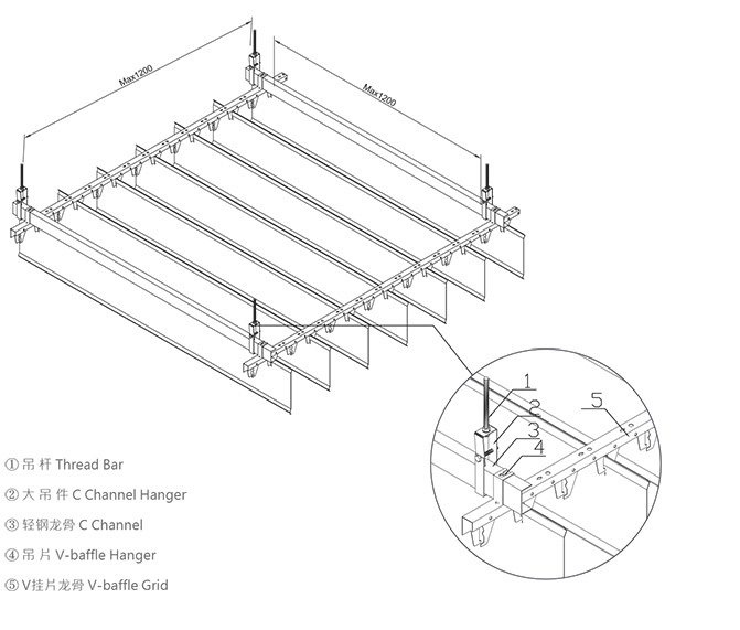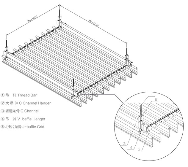 ●Suspended strip metal ceiling of V-baffle System is an opening type.