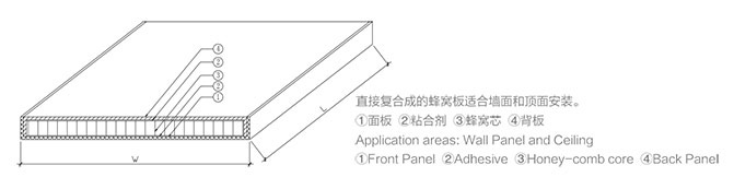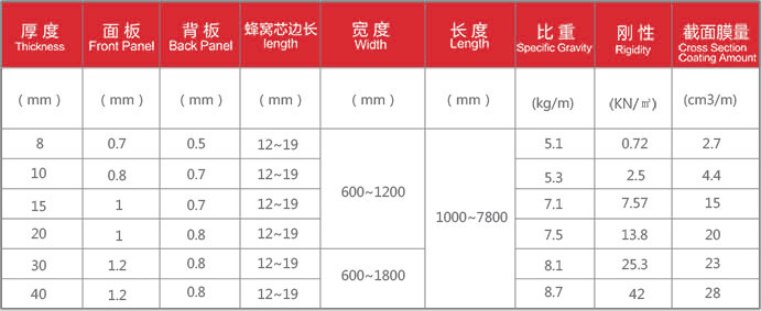 板面最大尺寸可达1800×7800,由于中间有蜂窝芯粘合,板面亦有极高的平整度。内层为特制的六边形铝蜂窝,由硬度达到H19的铝合金构成,作为粘附在夹层结构中的芯板,在切向上承受压力。这些相互牵制的密集蜂窝犹如许多小工字梁,可分散承担来自面板方向的压力,使板受力均匀,保证了面板在较大面积时仍能保持很高的平整度。另外,空心蜂窝还能大大减弱板体的热膨胀性。